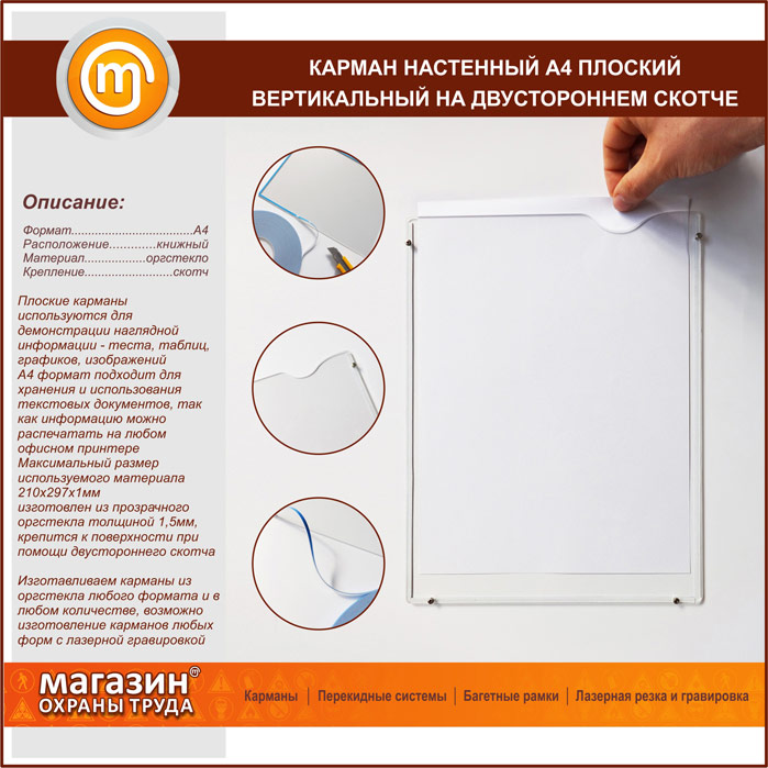 Карман настенный А4 плоский вертикальный на двустороннем скотче в Новом Уренгое купить