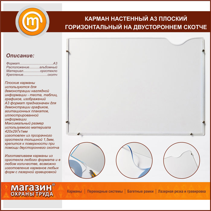 Карман настенный А3 плоский горизонтальный на двустороннем скотче в Новом Уренгое купить