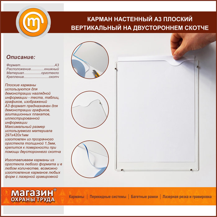 Карман настенный А3 плоский вертикальный на двустороннем скотче в Новом Уренгое купить