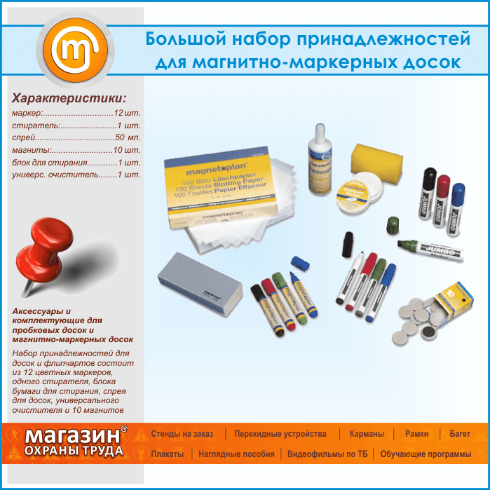 Предлагаем Вашему вниманию набор принадлежностей для досок и флипчартов. Набор состоит из 12 цветных маркеров, одного стирателя, блока бумаги для стирания, спрея для досок, универсального очистителя и 10 магнитов