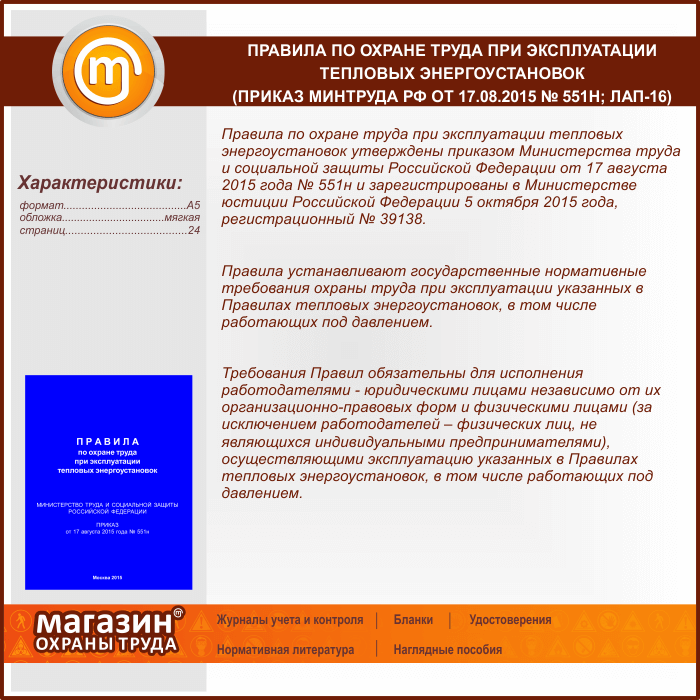 Правила по охране труда при эксплуатации тепловых энергоустановок (Приказ Минтруда РФ от 17.08.2015 № 551н) (ЛАП-16) в Новом Уренгое купить