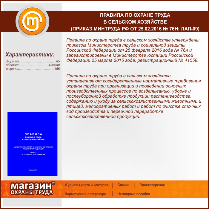 Правила по охране труда в сельском хозяйстве (Приказ Минтруда РФ от 25.02.2016 № 76н) (ЛАП-09) в Новом Уренгое купить