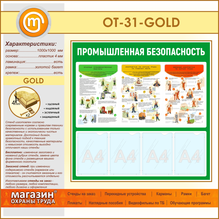 Стенд «Промышленная безопасность» с 4 карманами (OT-31-GOLD) в Новом Уренгое купить