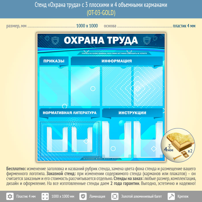 Стенд «Охрана труда» с 4 плоскими и 4 объемными карманами (OT-03-GOLD) в Новом Уренгое купить