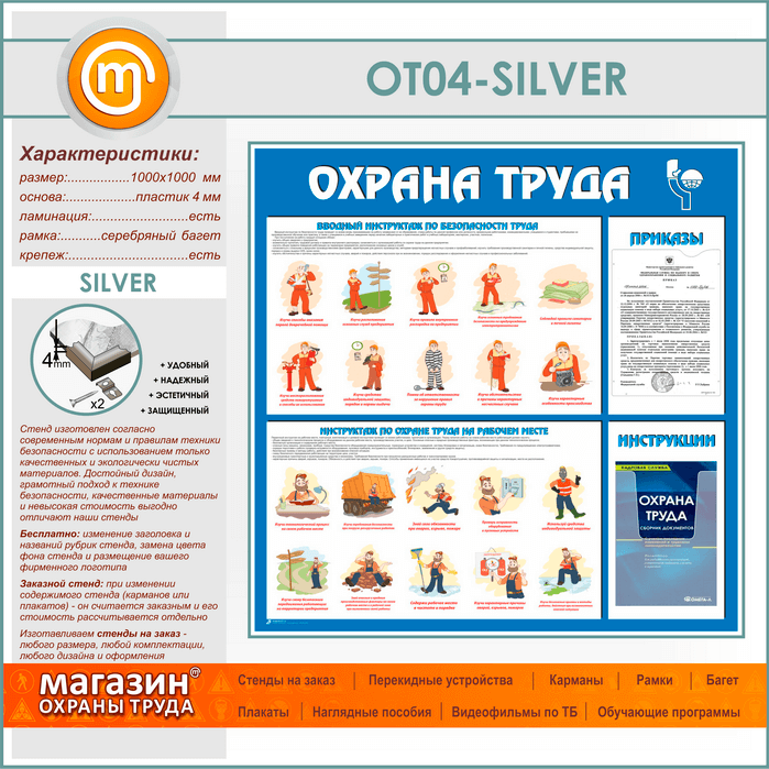 Стенд «Охрана труда» с плоским и объемным карманами (OT-04-SILVER) в Новом Уренгое купить