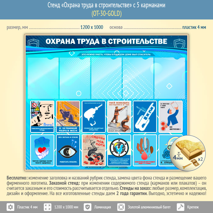 Стенд «Охрана труда в строительстве» с 5 карманами (OT-30-GOLD) в Новом Уренгое купить