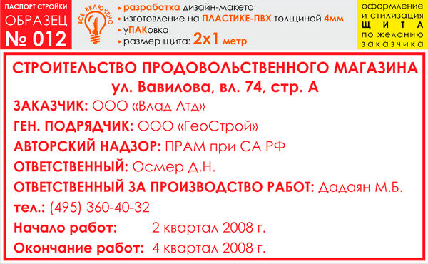 Паспорт стройки, образец № 12 (пластик 4 мм, 2000х1000 cм) в Новом Уренгое купить