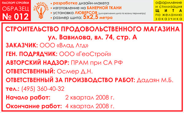Паспорт стройки, образец № 12 (баннерная ткань, 5000х2500 cм) в Новом Уренгое купить