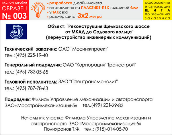 Предлагаем Вам изготовление паспорта стройки на баннерной ткани и ПВХ-пластике. В цену включены: разработка и согласование макета, изготовление и упаковка, а также НДС 18%. На данной странице представлены варианты материалов и размеров для образца № 3. Помимо представленных размеров мы можем изготовить паспорт объекта любого другого размера (цену уточняйте у менеджеров) и на любом материале (включая металл)