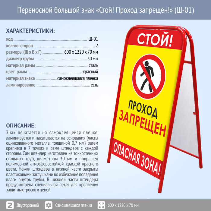 Переносной большой знак «Стой! Проход запрещен!» (Ш-01, двусторонний, самоклеящаяся пленка) в Новом Уренгое купить