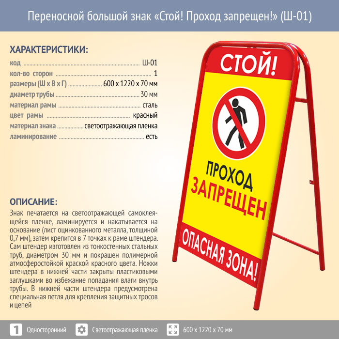 Переносной большой знак «Стой! Проход запрещен!» (Ш-01, односторонний, светоотражающая пленка) в Новом Уренгое купить