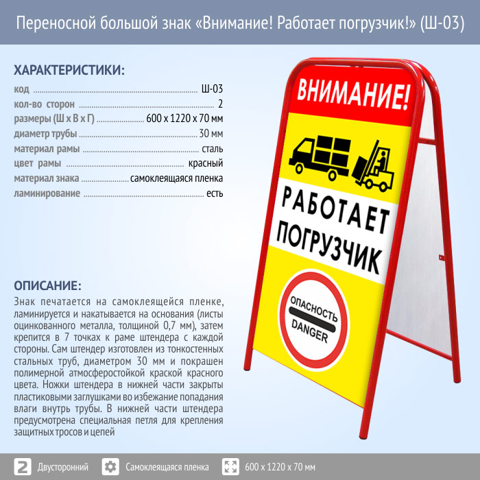 Переносной большой знак «Внимание! Работает погрузчик!» (Ш-03, двусторонний, самоклеящаяся пленка) в Новом Уренгое купить