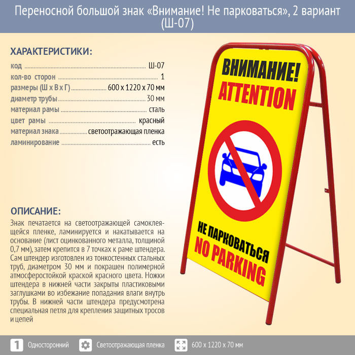 Переносной большой знак «Внимание! Не парковаться», 2 вариант (Ш-07, односторонний, светоотражающая пленка) в Новом Уренгое купить