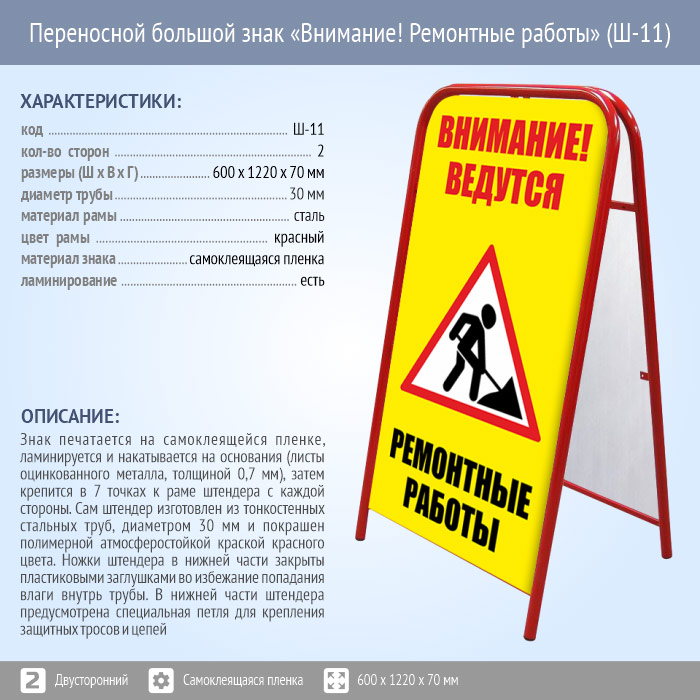 Переносной большой знак «Внимание! Ремонтные работы» (Ш-11, двусторонний, самоклеящаяся пленка) в Новом Уренгое купить