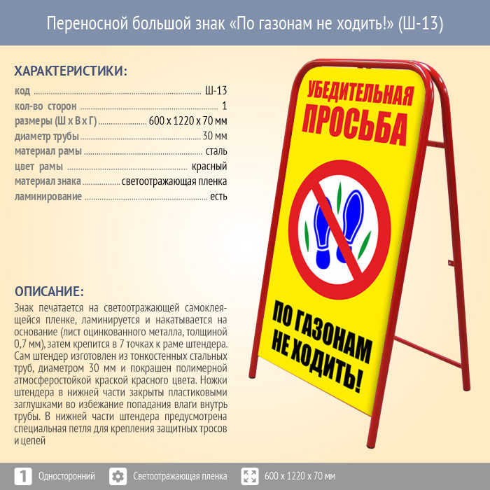Переносной большой знак «По газонам не ходить!» (Ш-13, односторонний, светоотражающая пленка) в Новом Уренгое купить