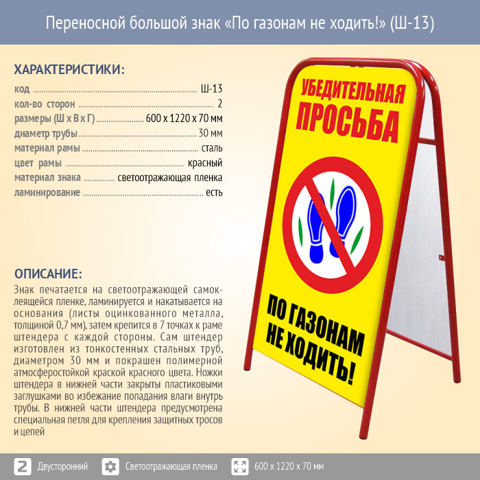 Переносной большой знак «По газонам не ходить!» (Ш-13, двусторонний, светоотражающая пленка) в Новом Уренгое купить