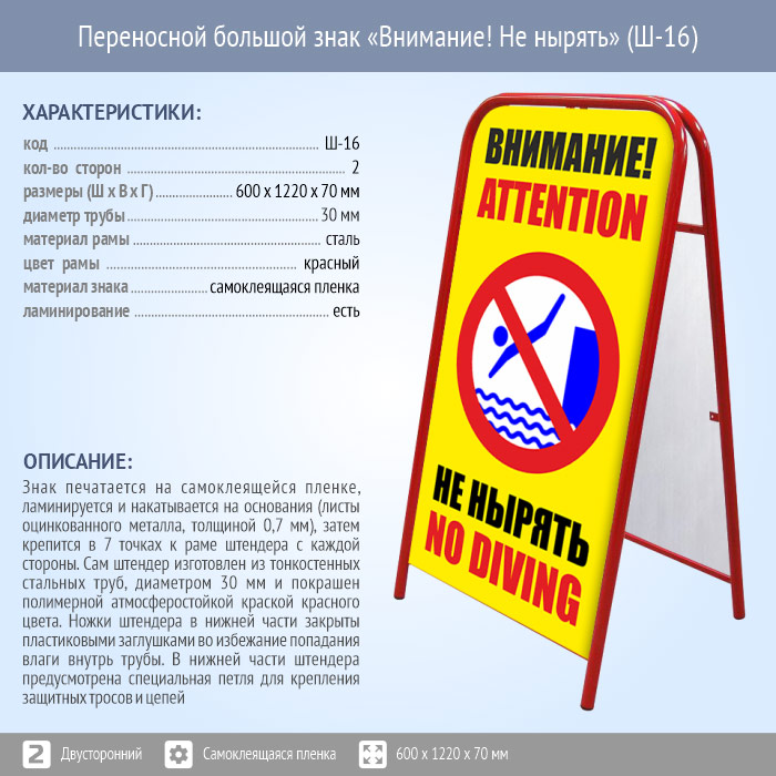 Переносной большой знак «Внимание! Не нырять» (Ш-16, двусторонний, самоклеящаяся пленка) в Новом Уренгое купить
