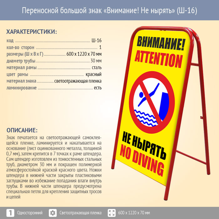 Переносной большой знак «Внимание! Не нырять» (Ш-16, односторонний, светоотражающая пленка) в Новом Уренгое купить