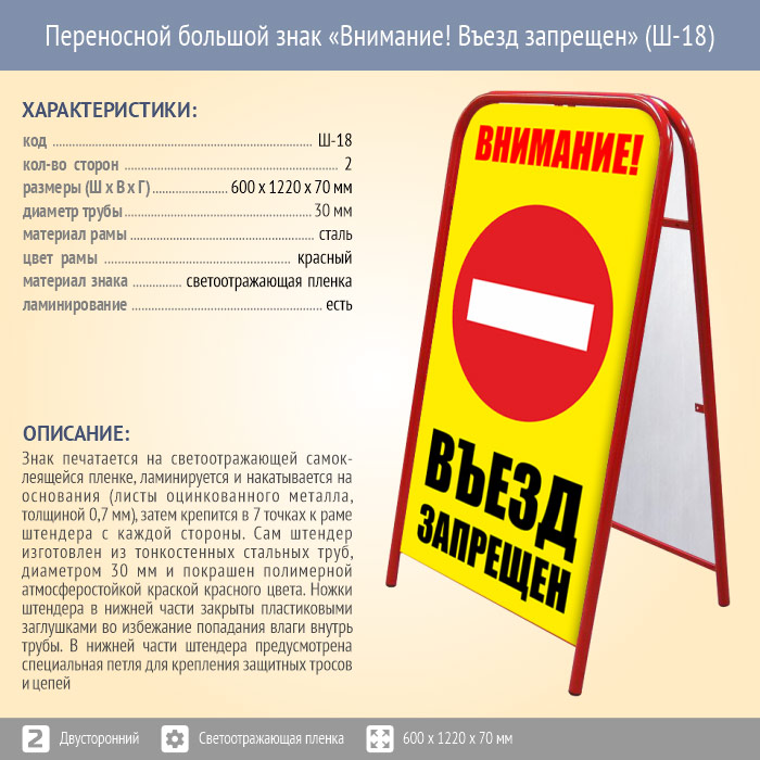 Переносной большой знак «Внимание! Въезд запрещен» (Ш-18, двусторонний, светоотражающая пленка) в Новом Уренгое купить