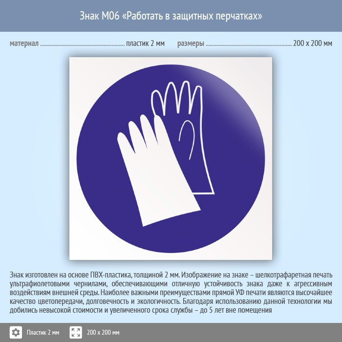 Знак M06 «Работать в защитных перчатках» (пластик, 200х200 мм) в Новом Уренгое купить