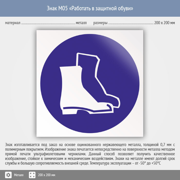 Знак M05 «Работать в защитной обуви» (металл, 200х200 мм) в Новом Уренгое купить