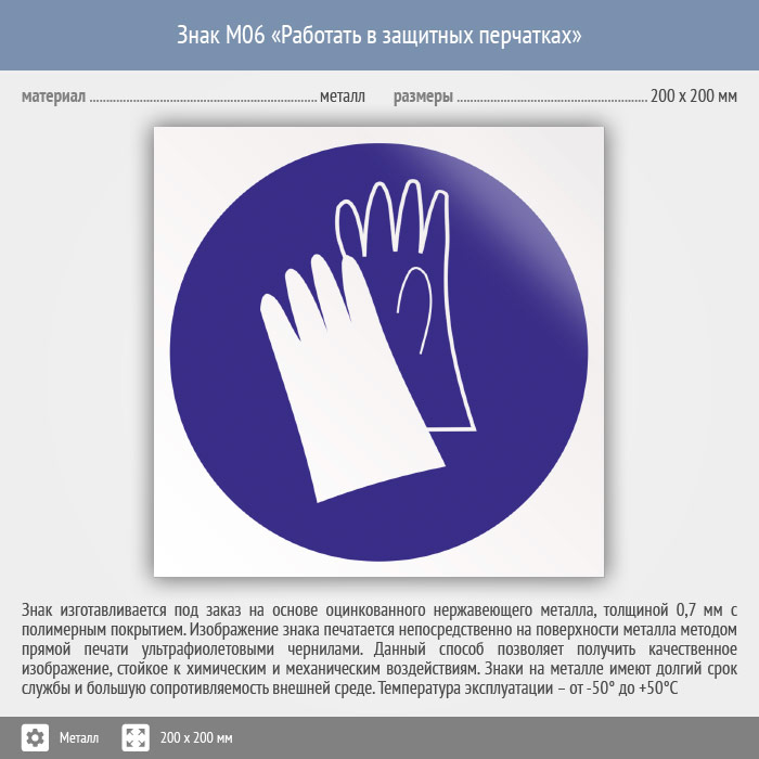 Знак M06 «Работать в защитных перчатках» (металл, 200х200 мм) в Новом Уренгое купить