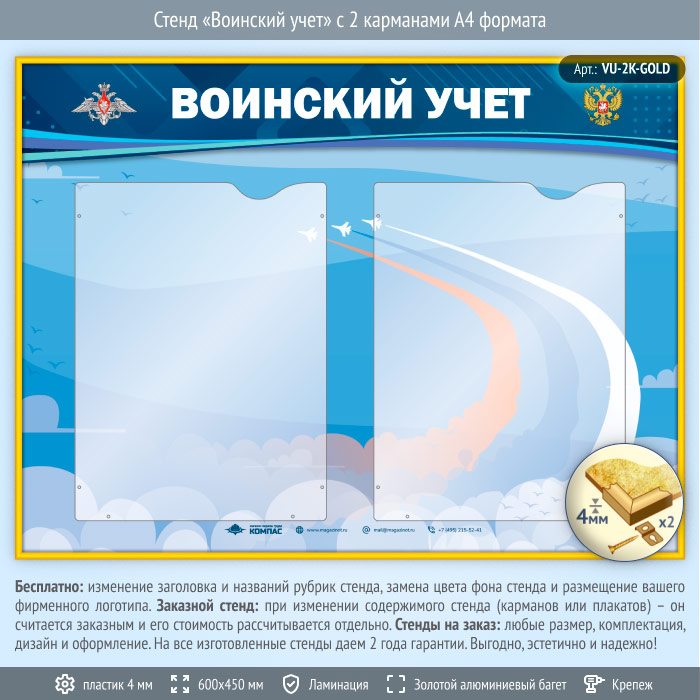 Стенд «Воинский учет» с 2 карманами А4 формата (VU-2K-GOLD) в Новом Уренгое купить