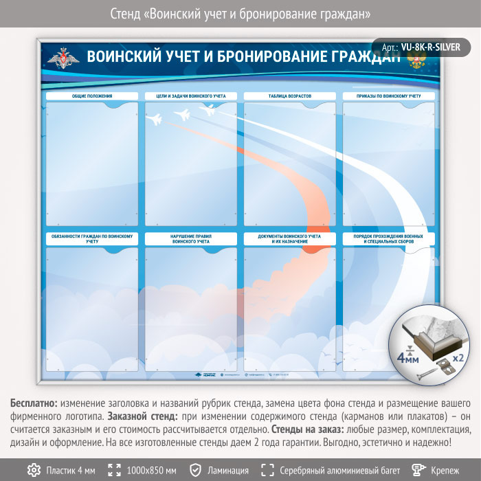 Стенд «Воинский учет и бронирование граждан» с 8 карманами А4 формата (VU-8K-R-SILVER) в Новом Уренгое купить