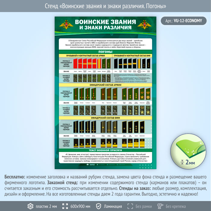 Стенд «Воинские звания и знаки различия. Погоны» (VU-12-ECONOMY) в Новом Уренгое купить
