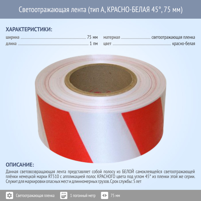 Светоотражающая сигнальная лента (тип А, КРАСНО-БЕЛАЯ 45°, 75 мм х 1 п.м.) в Новом Уренгое купить