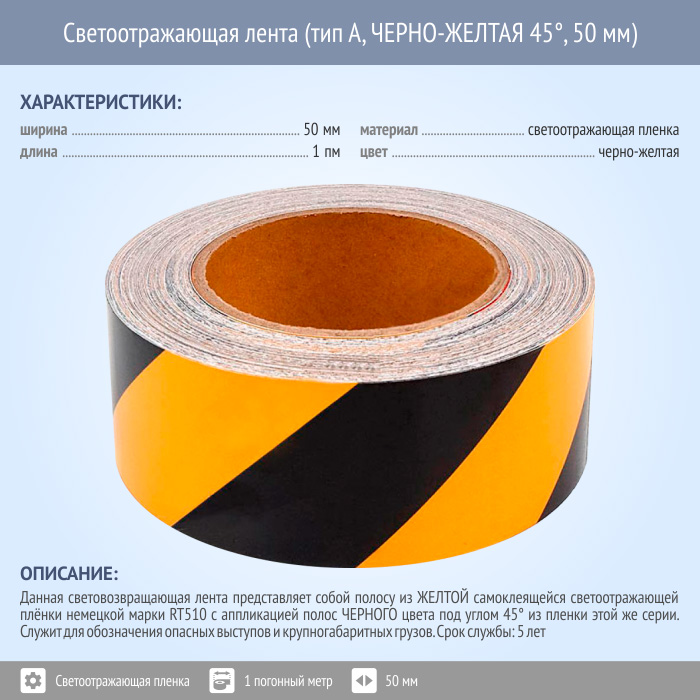 Светоотражающая сигнальная лента (тип А, ЧЕРНО-ЖЕЛТАЯ 45°, 50 мм х 1 п.м.) в Новом Уренгое купить