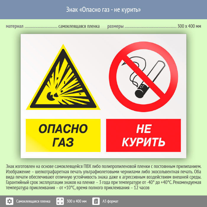 Знак «Опасно газ – не курить» может быть изготовлен любого размера на самоклеящейся пленке, пластике толщиной 0.5, 2 или 4 мм и металле. Также возможно применение фотолюминесцентных и световозвращающих материалов