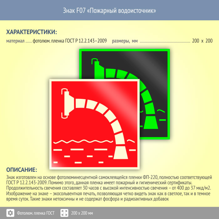 Знак F07 «Пожарный водоисточник» (фотолюминесцентная пленка ГОСТ 34428-2018, 200х200 мм) в Новом Уренгое купить