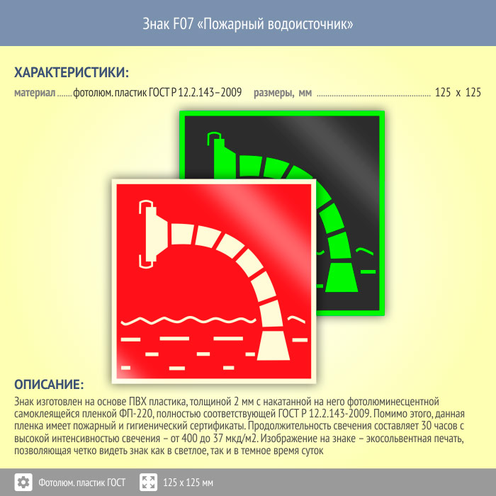 Знак F07 «Пожарный водоисточник» (фотолюминесцентный пластик ГОСТ 34428-2018, 125х125 мм) в Новом Уренгое купить