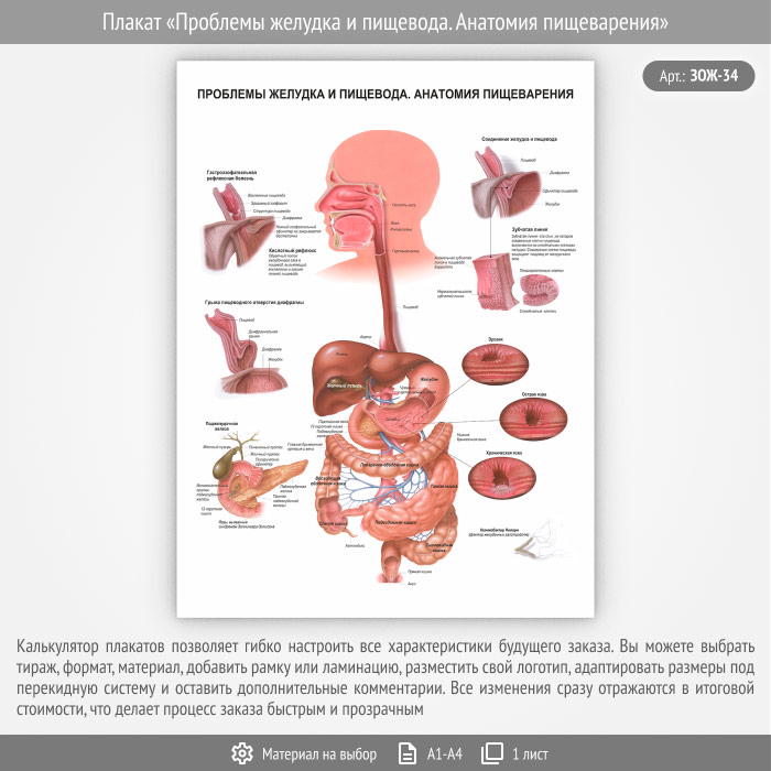Плакат «Проблемы желудка и пищевода. Анатомия пищеварения» (ЗОЖ-34, 1 лист) в Новом Уренгое купить